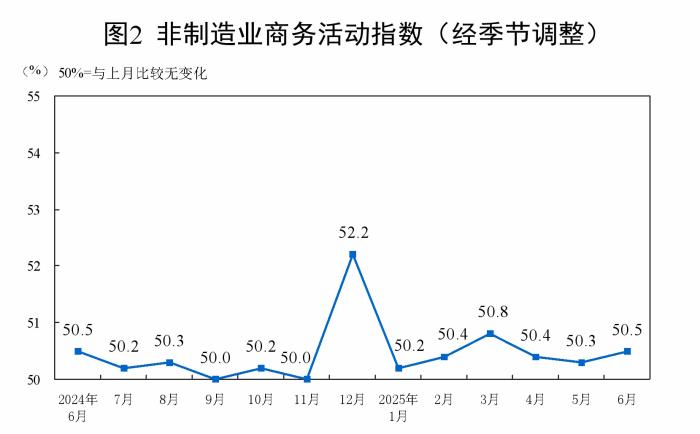 6月份,非制造業(yè)商務(wù)活動(dòng)指數(shù)為50.5%,比上月上升0.2個(gè)百分點(diǎn),非制造業(yè)總體繼續(xù)保持?jǐn)U張。