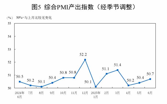 6月份,綜合PMI產(chǎn)出指數(shù)為50.7%,比上月上升0.3個(gè)百分點(diǎn),表明中國(guó)企業(yè)生產(chǎn)經(jīng)營(yíng)活動(dòng)總體擴(kuò)張有所加快。