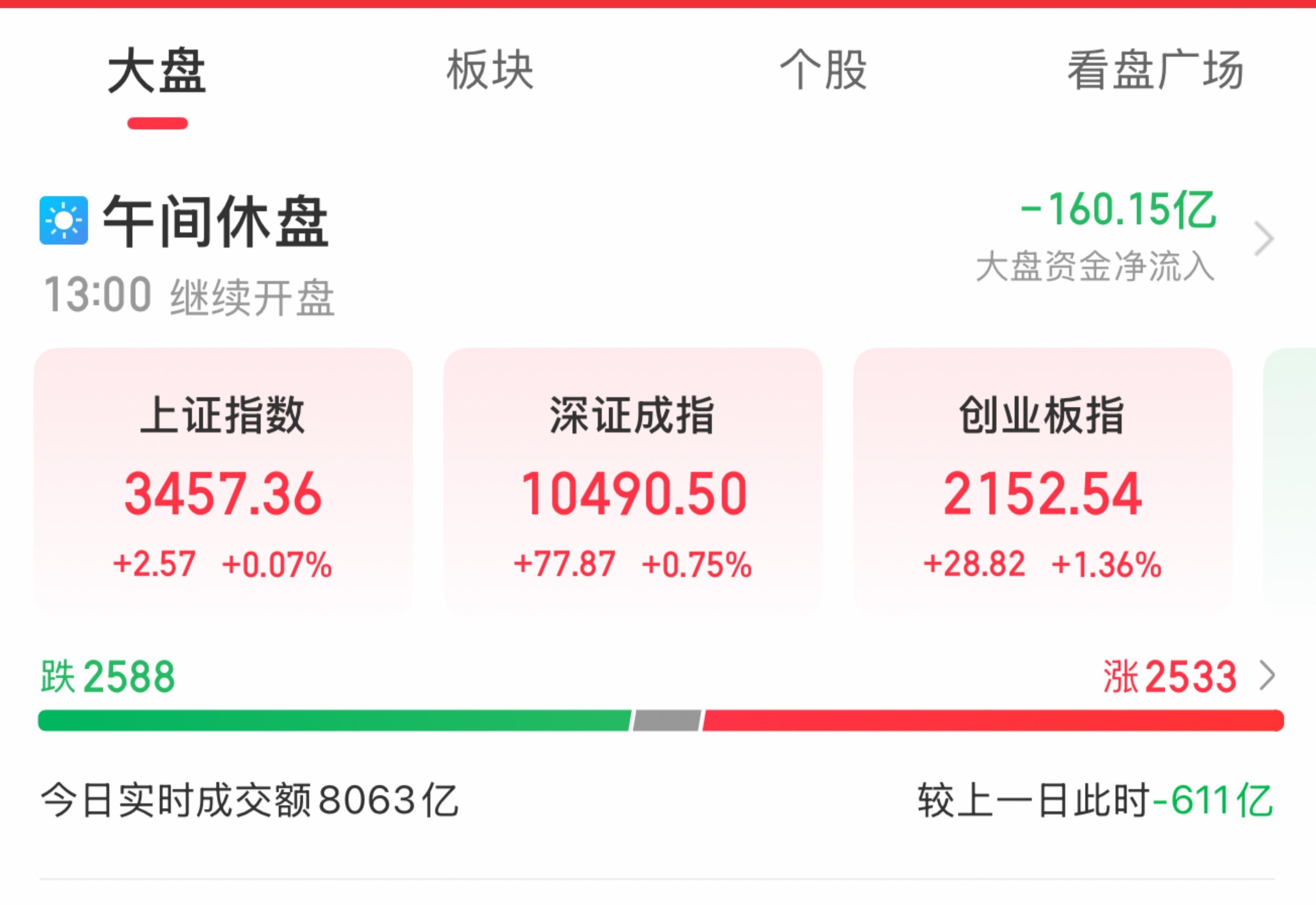 A股三大指數(shù)早盤集體上漲,截至午盤,滬指漲0.07%,深成指漲0.75%,創(chuàng)業(yè)板指漲1.36%,北證50指數(shù)跌0.09%。全市場半日成交額8063億元,較上日縮量611億元。全市場超2500只個(gè)股上漲。