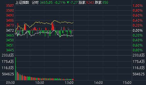截至午間收盤,滬指報(bào)3465.05點(diǎn),跌0.21%;深成指報(bào)10434.83點(diǎn),跌0.70%;創(chuàng)指報(bào)2129.34點(diǎn),跌1.25%。