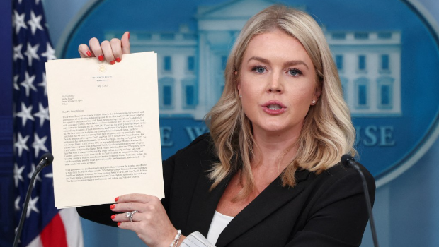 ▲白宮發(fā)言人萊維特在記者會上展示美國總統(tǒng)特朗普致日本首相石破茂的信件。路透社