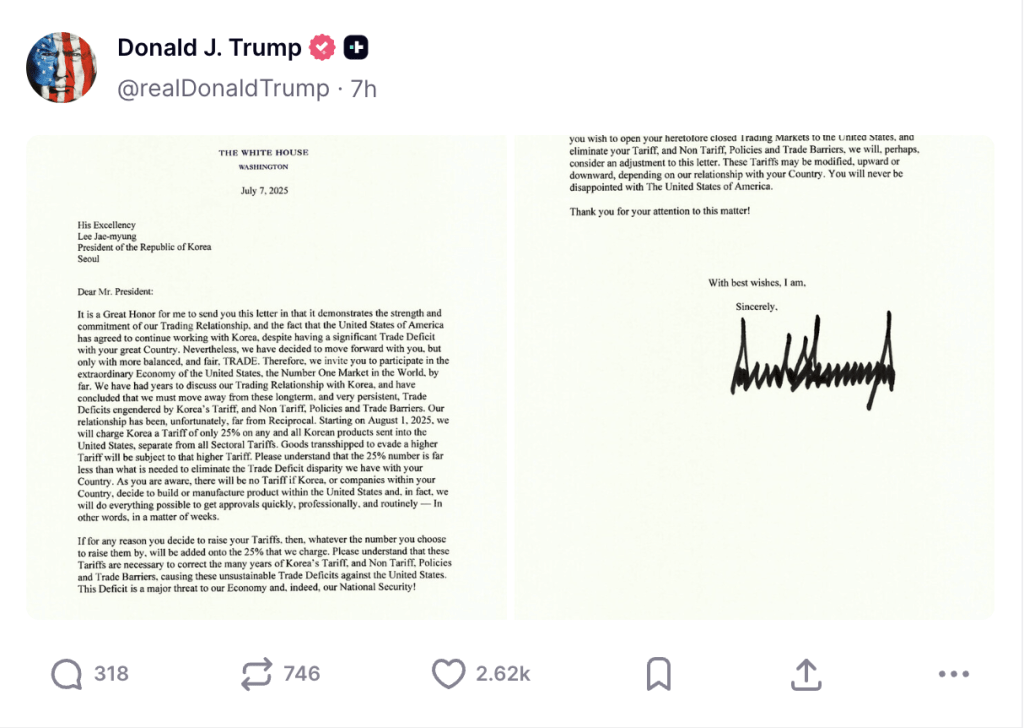 特朗普在其社交平臺 Truth Social 上發(fā)布致日本首相石破茂與韓國總統(tǒng)李在明的信函,正式通知關稅將于下月生效。他在信中表示:“如果你們出于任何原因決定提高關稅,那么無論你們選擇提高多少,都將在我們征收的25%關稅基礎上加征關稅。”