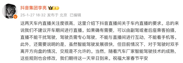 1月27日,抖音集團(tuán)副總裁李亮發(fā)文表示:“如確有需要,可以由副駕或者后座乘客拍攝,直播不能干擾駕駛。駕駛員需專心駕駛,不能與直播間進(jìn)行互動(dòng),不能看手機(jī)等。”