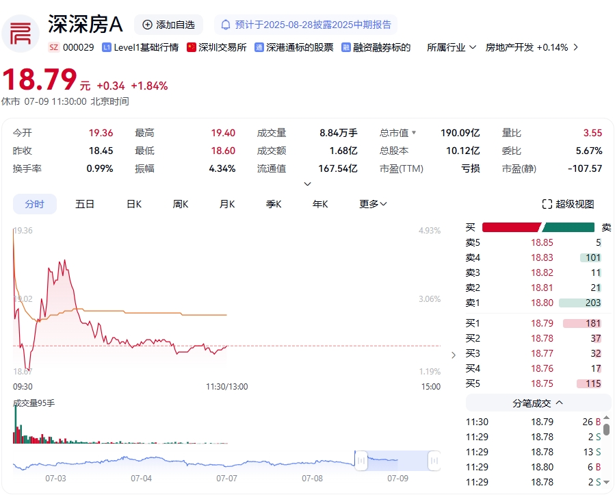 深深房A(000029.SZ)7月8日晚發(fā)布公告稱,預計2025年上半年實現(xiàn)凈利潤8500萬元至12000萬元,較上年同期的562.28萬元同比增長1411.70%至2034.17%;扣除非經(jīng)常性損益后的凈利潤預計為7800萬元至11000萬元,較上年同期的虧損519.71萬元同比增長1600.84%至2216.57%,基本每股收益預計為0.0815元/股至0.1150元/股。7月9日,截至午盤收市,深深房A報收18.79元,漲幅1.84%,總市值190億。