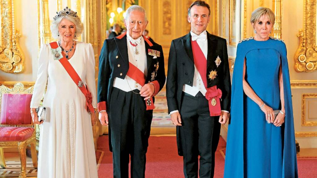 馬克龍夫婦到溫莎堡出席國宴,獲英皇查理斯三世伉儷歡迎。 法新社