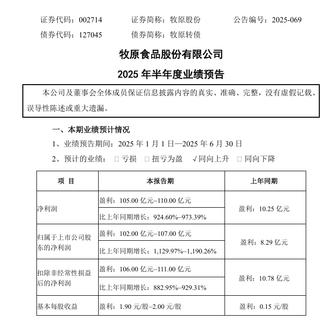 7月9日晚間,“豬茅”牧原股份(代碼:002714.SZ)發(fā)布2025年上半年度業(yè)績預(yù)告,預(yù)計(jì)上半年實(shí)現(xiàn)凈利潤105億~110億元,同比增長924.60%~973.39%;歸屬于上市公司股東的凈利潤同比增長1129.97%~1190.26%。業(yè)績可謂“炸裂”,但市場卻不買單,7月10日,牧原股份午市收報(bào)44.90元,跌幅0.44%,總市值2453億元。