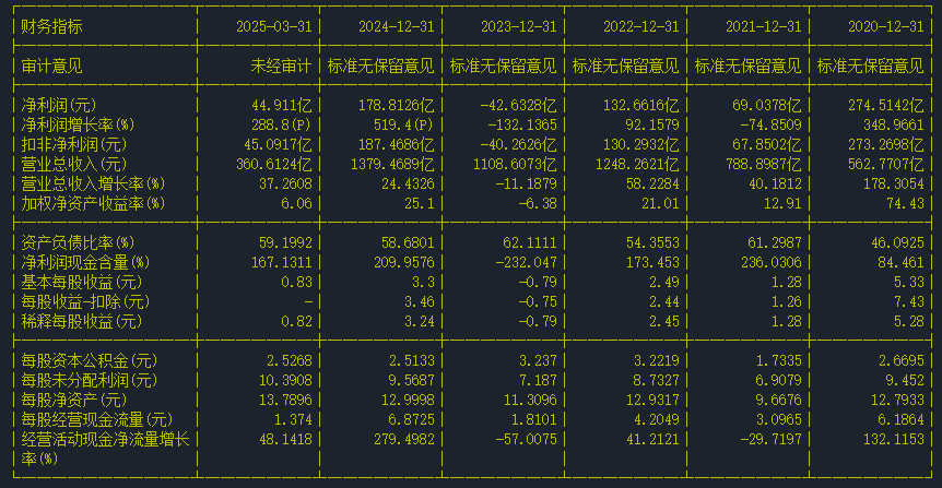 公告稱,預(yù)計(jì)2025年上半年歸屬于上市公司股東的凈利潤盈利102億-107億,同比增長1129.97%-1190.26%;扣除非經(jīng)常性損益后的凈利潤預(yù)計(jì)盈利106億-111億,同比增長882.95%-929.31%;預(yù)計(jì)基本每股收益盈利1.9元/股至2元/股,遠(yuǎn)超同期0.15元/股。