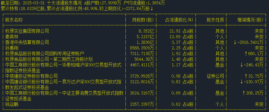 從前十大流通股股東看,截至2025年3月底,有三家增持,分別為牧原食品股份有限公司回購專用證券賬戶、中信建投證券、中證主要消費(fèi)交易型開放式指數(shù)證券投資基金;有三家減持,分別為香港中央結(jié)算有限公司、華泰柏瑞滬深300交易型開放式指數(shù)證券投資基金、易方達(dá)滬深300交易型開放式指數(shù)發(fā)起式證券投資基金。