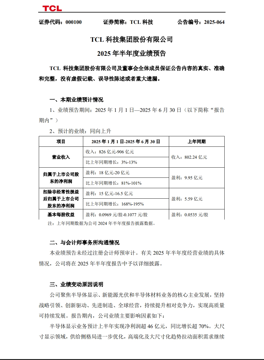 TCL科技(000100.SZ)7月9日晚間發(fā)布業(yè)績預(yù)告,預(yù)計2025年上半年歸屬于上市公司股東的凈利潤18億元~20億元,同比增長81%~101%;基本每股收益0.0969元~0.1077元。