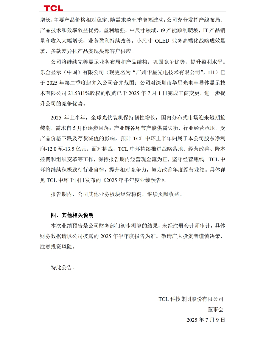 2025 年上半年,全球光伏裝機保持韌性增長,國內(nèi)分布式市場迎來短期搶裝潮,需求自 5 月份逐步回落;產(chǎn)業(yè)鏈各環(huán)節(jié)產(chǎn)能供需失衡,行業(yè)經(jīng)營承壓。受產(chǎn)品價格下跌及存貨減值的影響,預(yù)計 TCL 中環(huán)上半年歸屬于本公司股東凈利潤-12.0 至-13.5 億元。