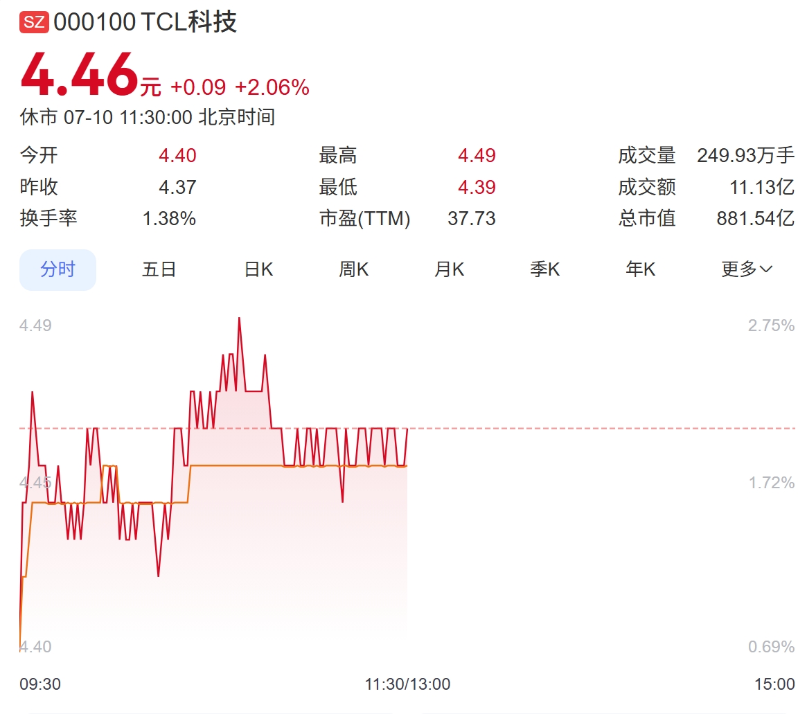 7月10日,截至午盤收市,TCL科技收4.46元,漲幅2.06%,總市值881.54億元。