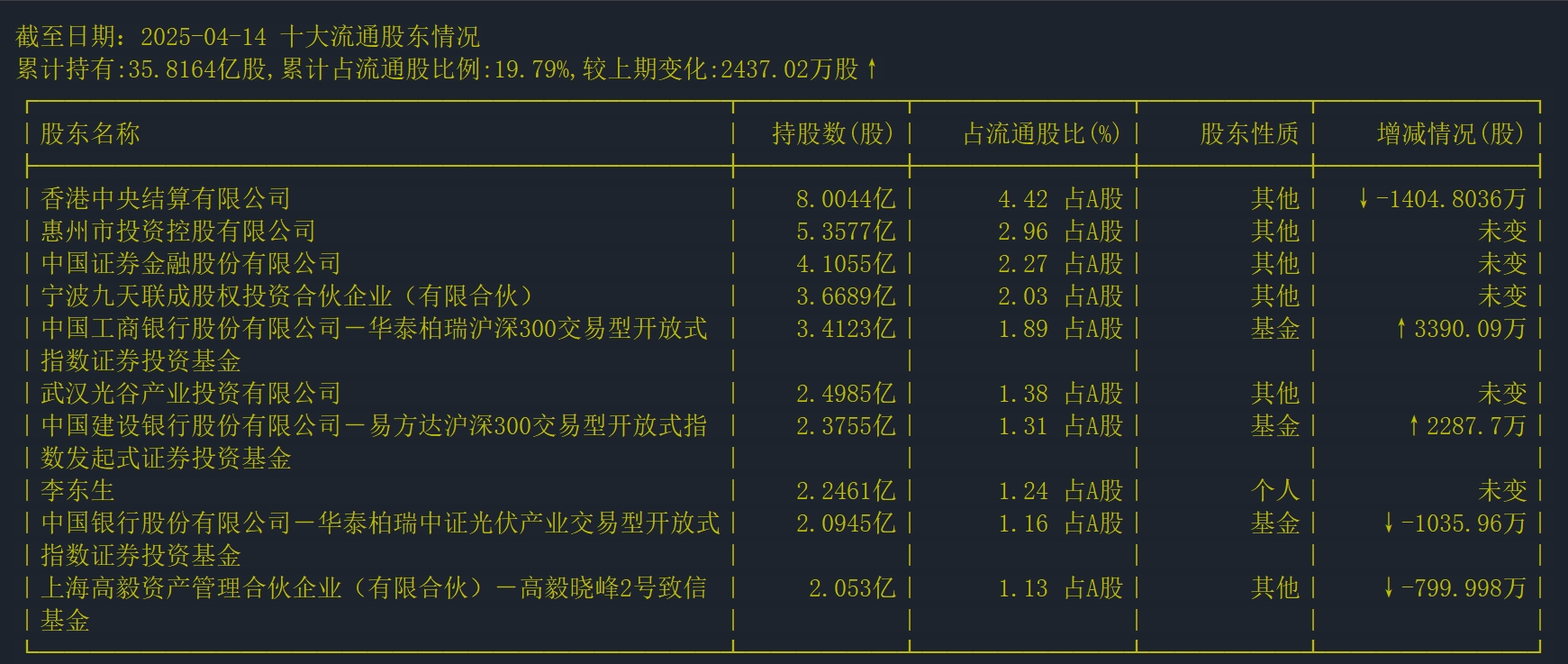 截至4月14日,TCL科技十大流通股東累計持有35.8164億股,占比19.79%。其中有兩家增持,分別是華泰柏瑞滬深300交易型開放式指數(shù)證券投資基金、易方達滬深300交易型開放式指數(shù)發(fā)起式證券投資基金。