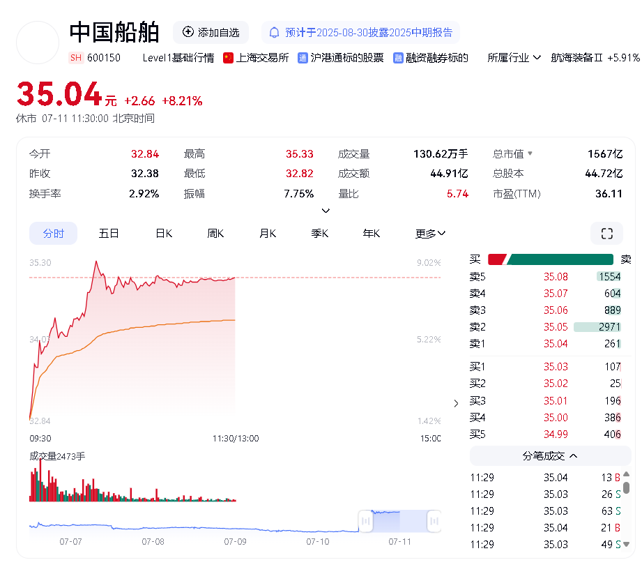 7月10日消息,中國船舶(代碼:600150.SH)發(fā)布2025年上半年業(yè)績預(yù)告,公司預(yù)計(jì)上半年實(shí)現(xiàn)歸屬于母公司所有者的凈利潤在28億元至31億元之間,同比增長98.25%至119.49%。這一業(yè)績預(yù)告引發(fā)市場廣泛關(guān)注,公告發(fā)布后,7月11日早盤,中國船舶高開高走,截至中午收市,股價(jià)報(bào)35.04元,漲幅8.21%,成交額達(dá)44.91億元。