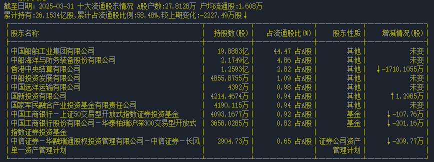 從前十大流通股東看,截至2025年3月底,有一家增持,四家減持,其他保持不變,增持的為國新投資有限公司,持股比例0.94%;減持的為香港中央結(jié)算有限公司、上證50交易型開放式指數(shù)證券投資基金、華泰博瑞滬深300交易型開放式指數(shù)證券投資基金、長風(fēng)單一資產(chǎn)管理計(jì)劃。