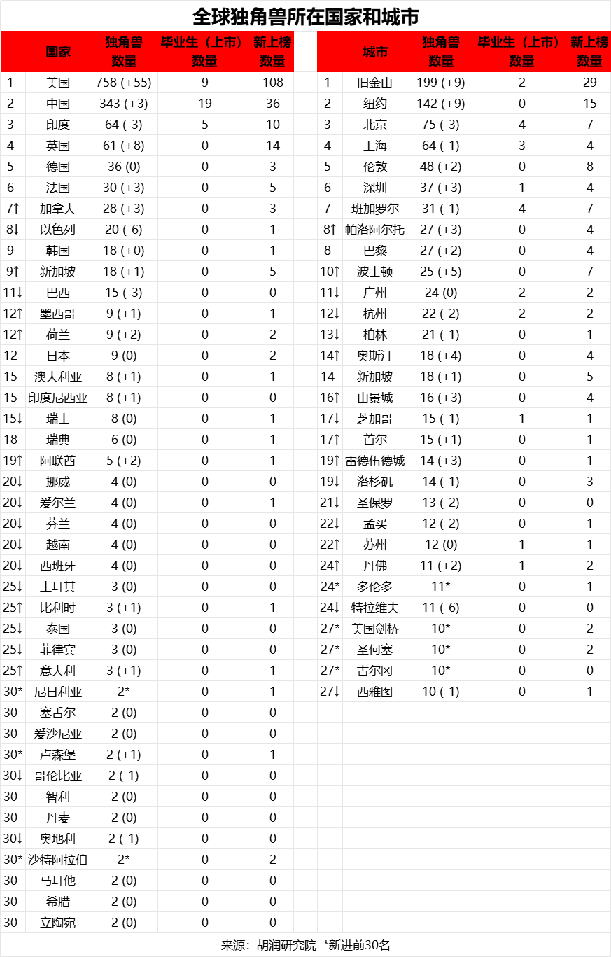 ▲全球獨(dú)角獸所在國家和城市,來源:胡潤研究所。