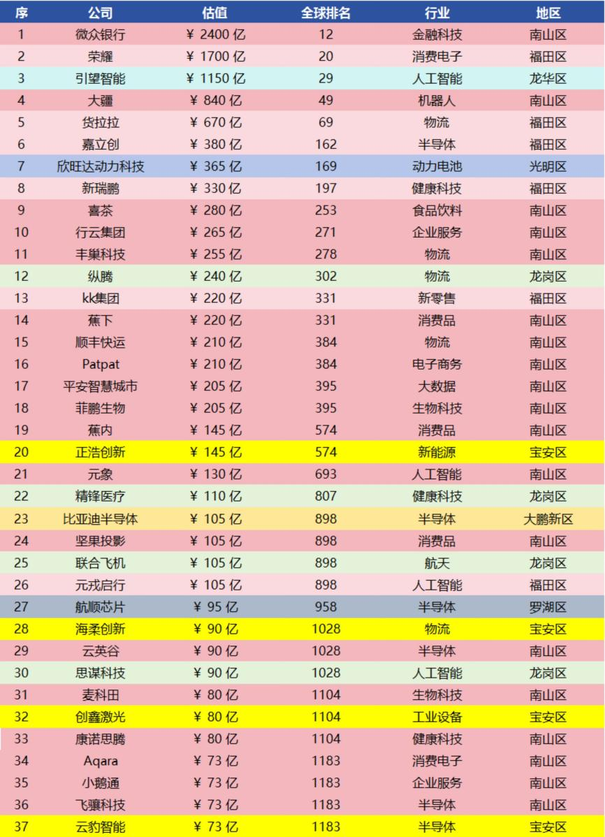 ▲深圳入選獨(dú)角獸企業(yè)榜單37家列表。