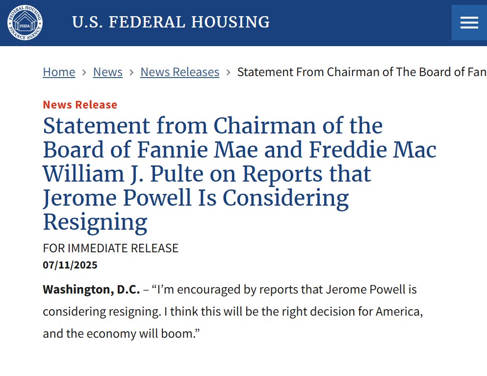 美國聯(lián)邦住房金融局(FHFA)主席普爾特(Bill Pulte)引用未具體說明的報道,稱聯(lián)儲局主席鮑威爾正考慮辭職。