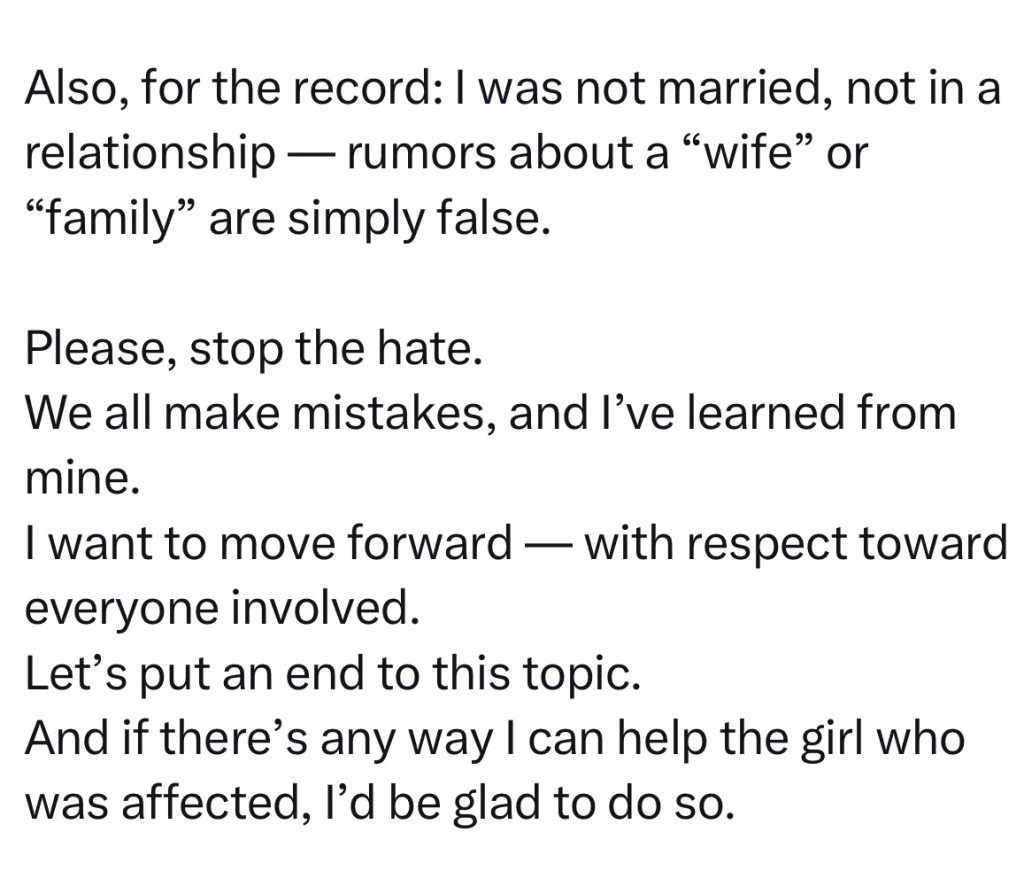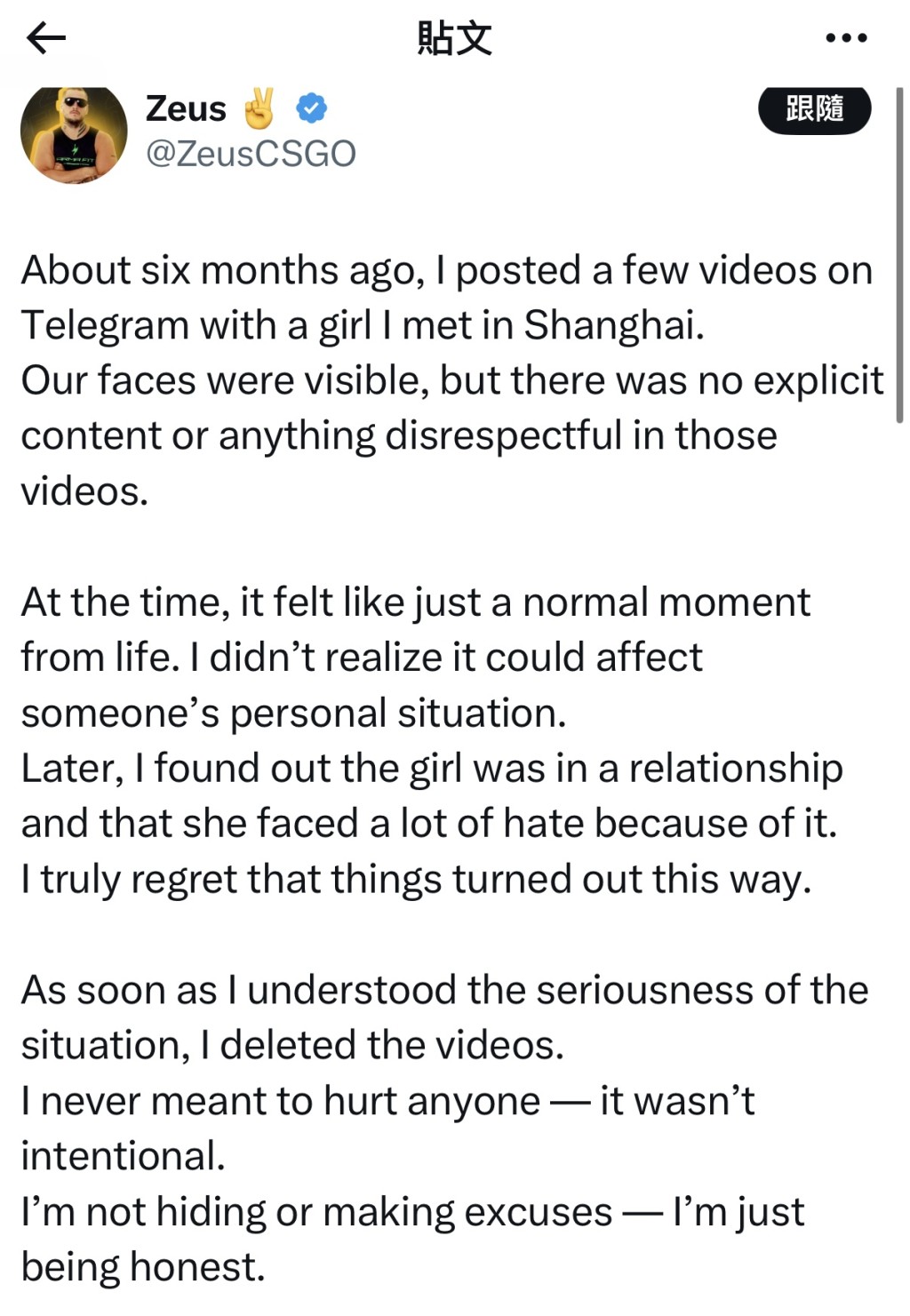 宙斯發(fā)文辯稱,視頻無露骨內(nèi)容,自己單身無子女。 X@ZenusCSGO2