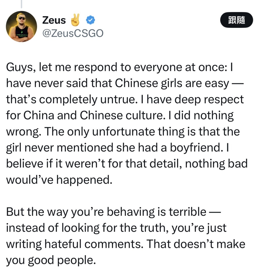宙斯發(fā)文辯稱,視頻無露骨內(nèi)容,自己單身無子女。 X@ZenusCSGO3