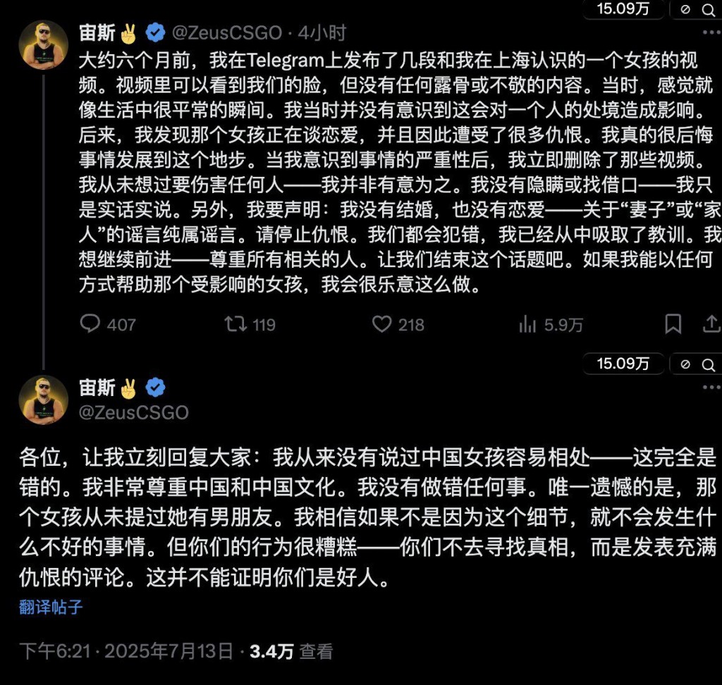烏克蘭知名電競選手Zeus(宙斯)去年底在粉絲群曬出在華期間與中國女生的私密視頻,受到關(guān)注。網(wǎng)傳雙方當(dāng)時(shí)均非單身(女方有男友,宙斯被曝已婚已育)。大連工業(yè)大學(xué)近日以“不當(dāng)行為”“有損國格”為由,公布涉事女生全名,開除她的學(xué)籍。相關(guān)話題沖上微博熱搜,引發(fā)爭議。宙斯今(14日)發(fā)文辯稱,視頻無露骨內(nèi)容,稱自己單身無子女,而女方隱瞞有男友。