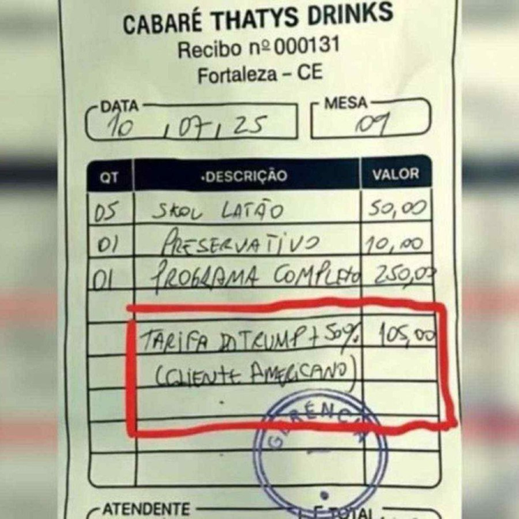 根據(jù)英國《太陽報》(The Sun)報導(dǎo),位于巴西東北部城市福塔雷薩(Fortaleza)的Cabaré Thatys Drinks妓院已經(jīng)開始向美國客人加收50%的稅率,而費(fèi)用名稱就寫著“特朗普關(guān)稅(Tarifa do Trump)+50%”,讓美國顧客一晚的“全套服務(wù)”費(fèi)用飆漲。