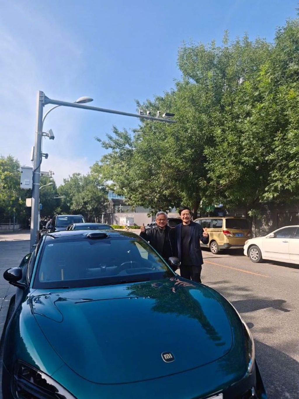 ▲黃仁勛與雷軍在小米汽車旁合影。(圖/翻攝微博)