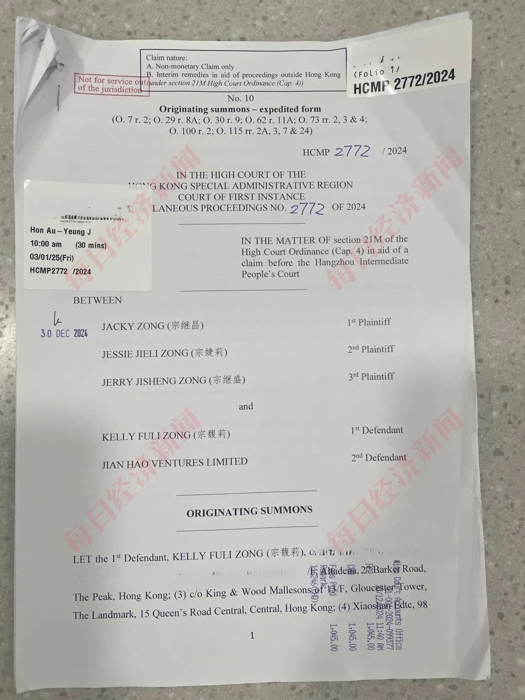 7月15日,每日經(jīng)濟(jì)新聞記者從香港高等法院獲取了原告方宗繼昌等三人的起訴狀原件。該法律文書顯示,案件原告方三人分別為Jacky Zong(宗繼昌)、Jessie Jiele Zong(宗婕莉)、Jerry Jisheng Zong(宗繼盛),被告方為Kelly Fuli Zong(宗馥莉)(第一被告人)和Jian Hao Ventures Limited(第二被告人,一家在英屬維京群島注冊的公司)。記者注意到,這起案件是以原訴傳票展開的法律程序。