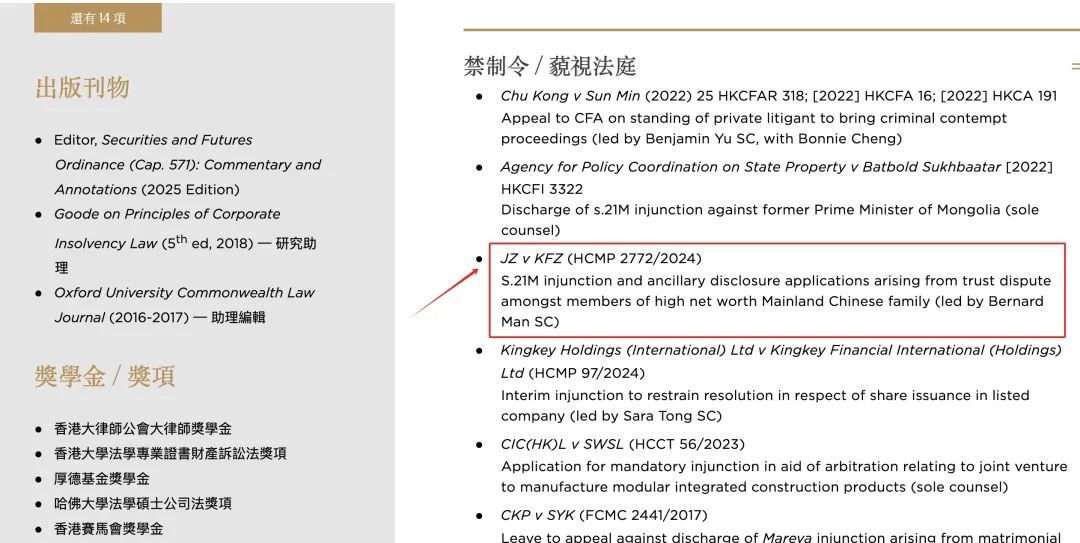 《每日經(jīng)濟(jì)新聞》記者查詢獲悉,香港一家律所的律師在官網(wǎng)展示了其代理上述案件的信息,他如是表述這宗案件:“因中國內(nèi)地高凈值家庭成員之間的信托糾紛,而產(chǎn)生的禁令及附帶披露申請?!逼浒讣幪柵c記者從香港高等法院獲取的案件編號一致。