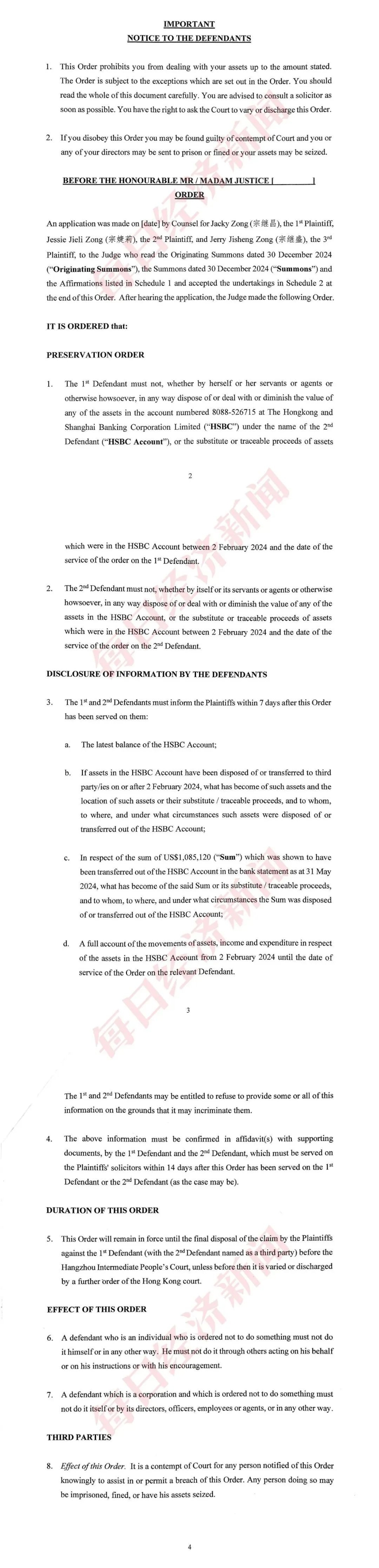 臨時禁止令要求宗馥莉、Jian Hao Ventures Limited不得自行或通過代理人等任何方式處置、處理或降低在香港匯豐銀行以第二被告人Jian Hao Ventures Limited名義開立的賬戶中的任何資產(chǎn),也不得處置或減少自2024年2月2日以來存于該匯豐賬戶中的任何資產(chǎn)的替代物或可追蹤收益。