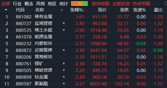板塊題材上,稀土、鋰礦沖高震蕩、大飛機、電力板塊午盤后走強。游戲、光伏板塊全天低位震蕩。