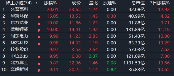 盤面上,稀土板塊沖高震蕩, 久吾高科20CM漲停,東方鋯業(yè)、華宏科技等漲停封板。