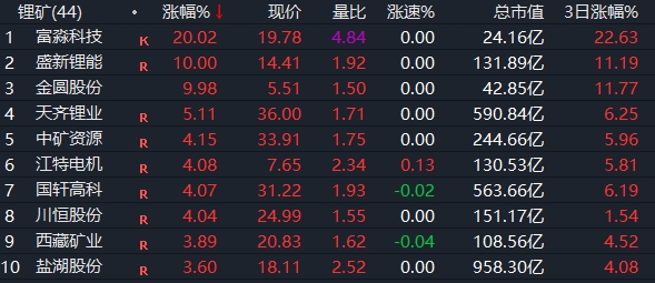 鋰礦板塊走高,富淼科技20CM漲停,盛新鋰能、金圓股份漲停封板。
