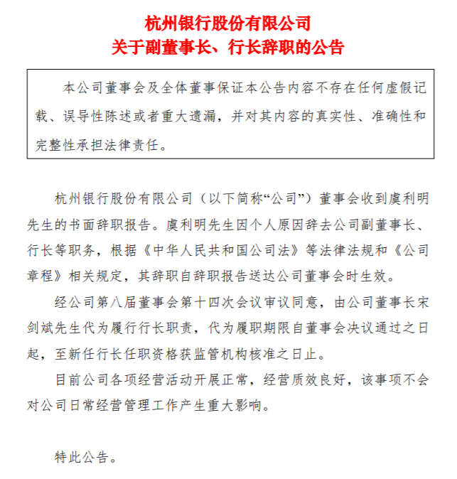 值得注意的是,4月2日,杭州銀行公告稱,董事會收到虞利明的書面辭職報告。