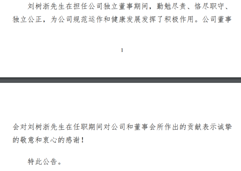 ▲(獨立董事劉樹浙辭職的公告)