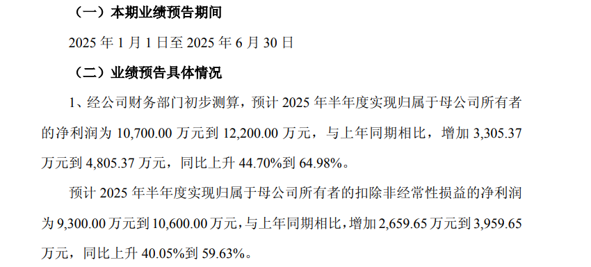 普萊柯(603566)近日發(fā)布2025年半年度業(yè)績預(yù)告,預(yù)計凈利同比增44.70%-64.98%。