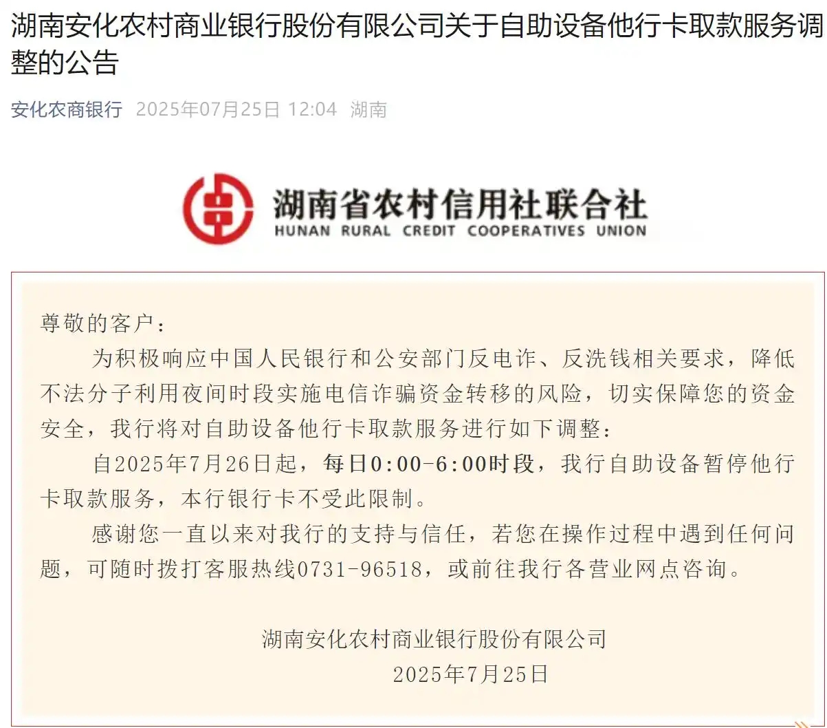 7月25日,湖南安化農(nóng)商銀行發(fā)布公告,為積極響應中國人民銀行和公安部門反電詐、反洗錢相關要求,降低不法分子利用夜間時段實施電信詐騙資金轉(zhuǎn)移的風險,切實保障客戶資金安全,該行將對自助設備他行卡取款服務進行調(diào)整。自2025年7月26日起,每日0:00-6:00時段,該行自助設備暫停他行卡取款服務,該行銀行卡不受此限制。