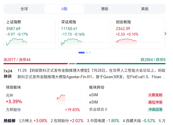 據(jù)新浪財(cái)經(jīng)7月28日消息,三大股指早盤分化,創(chuàng)指小幅收漲,滬指、深成指翻綠。截至午間收盤,滬指報(bào)3587.69點(diǎn),跌0.17%;深成指報(bào)11150.41點(diǎn),跌0.16%;創(chuàng)指報(bào)2342.39點(diǎn),漲0.10%。總體來看,個(gè)股跌多漲少,下跌個(gè)股超3000只。