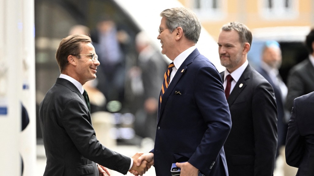 ▲瑞典總理克里斯特松(左)迎接美國財政部長貝森特(中)和美國貿(mào)易代表格里爾(右)。 路透社
