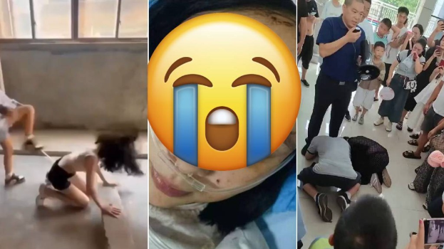 被虐打4小時的賴姓少女的父母,無聲哭跪官員求公道。X