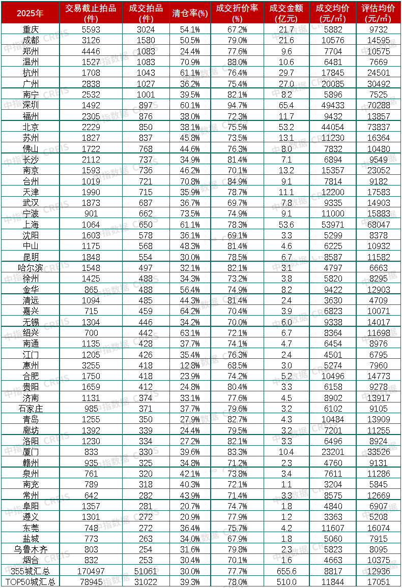 對比法拍市場成交最多的TOP50城,2025年法拍住宅房源成交最多TOP50城掛拍拍品總計7.9萬套,成交3.1萬套,成交量較上一年同比增長2.7%,成交套數(shù)最多城市在重慶、成都、鄭州、溫州、杭州等城市;top50城市清倉率39.3%,較上一年增加2.0個百分點;總成交金額510億元,占全國法拍住宅總成交77.8%,較上一年占比增加3.4個百分點。同比2024年成交量前50城總計掛拍住宅房源8.1萬套,成交總量3.0萬套,成交總金額572億元,占全國法拍住宅總成交金額74.4%。