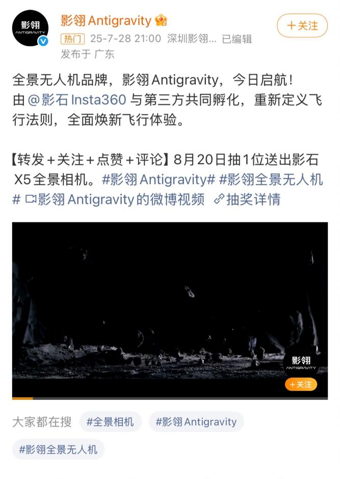 而影石科技與第三方共同孵化的全景無(wú)人機(jī)品牌影翎Antigravity近期也在微博發(fā)布宣傳片宣告“出道”,并將在8月開(kāi)啟共創(chuàng)公測(cè)。目前,社交媒體中已流傳出印有“Insta360”字樣的無(wú)人機(jī)照片,照片中無(wú)人機(jī)上貼著和汽車(chē)上市前路跑一樣的迷彩偽裝。