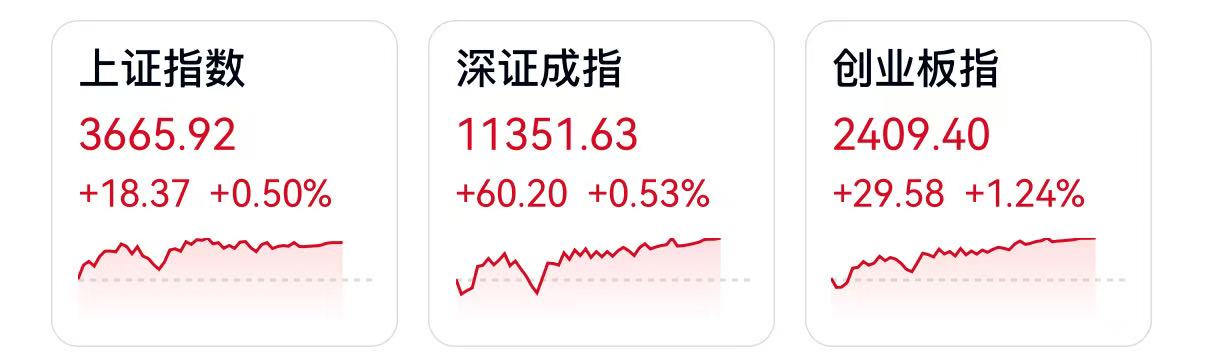 截至收盤,滬指報3665.92點(diǎn),漲0.50%;深成指報11351.63點(diǎn),漲0.53%;創(chuàng)指報2409.40點(diǎn),漲1.24%。
