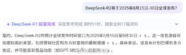 從網(wǎng)友向DeepSeek提出的問題看,該模型給出的答案是,DeepSeek-R2預(yù)計將在2025年8月15日至8月30日之間發(fā)布。