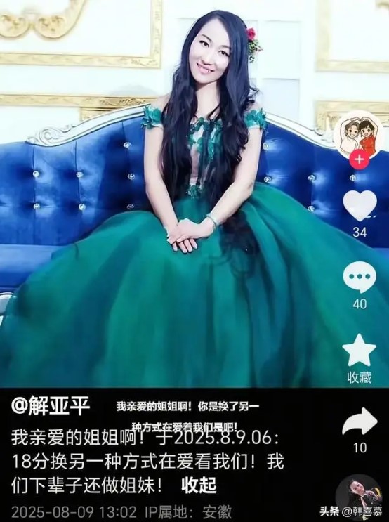于8月就未曾更新社交網(wǎng)的解亞嬌,原來(lái)已經(jīng)離世。 其妹妹解亞平于網(wǎng)上悲痛發(fā)布消息,她表示:“我親愛(ài)的姐姐啊! 于2025.8.9.06:18分換另一種方式在愛(ài)看我們! 我們下輩子還做姐妹!”,從文字中都看得出其妹妹覺(jué)得悲痛欲絕。