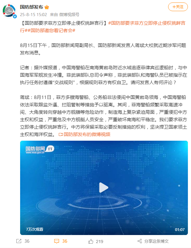 蔣斌:8月11日,菲方多艘海警船、公務(wù)船非法侵闖中國黃巖島領(lǐng)海,中國海警船依法采取跟監(jiān)外逼、攔阻管制等措施予以驅(qū)離。其間,菲海警船頻繁采取高速沖闖、大角度轉(zhuǎn)向穿越中方艦艏等危險動作,制造海上復(fù)雜緊迫局面,嚴(yán)重侵犯中方主權(quán)和權(quán)益,嚴(yán)重危及中方艦艇人員安全,嚴(yán)重破壞南海和平穩(wěn)定。我們要求菲方立即停止侵權(quán)挑釁言行。中方將保留采取必要反制措施的權(quán)利,堅決捍衛(wèi)國家領(lǐng)土主權(quán)和海洋權(quán)益。