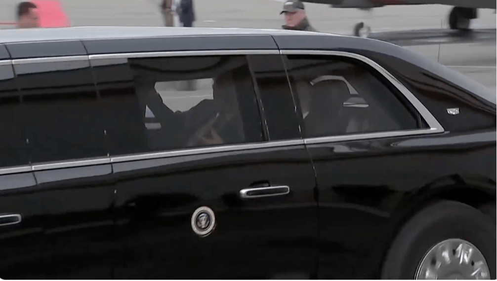 ▲特朗普和普京共同走進美國總統(tǒng)專用“野獸”防彈轎車,然后一同前往會談地點。影片截圖