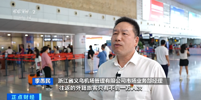浙江省義烏機場管理有限公司市場業(yè)務部經理 季愚民:以義烏到廣州的航線為例,去年七月,往返的外籍旅客只有不到一萬人次。但是今年七月呈爆發(fā)增長,這條航線往返的外籍旅客達到了2.57萬人次。