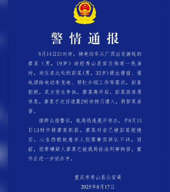 秀山縣公安局17日發(fā)通報(bào)指,8月14日21時許,騎電動車從廣西出發(fā)游玩的廖某(男,19歲)途經(jīng)秀山縣官莊街道一民房時,向住在此處的彭某(男,32歲)提出借宿、借電源給電動車充電、幫忙介紹工作等需求,彭某拒絕,雙方發(fā)生爭執(zhí)。廖某離開后,彭某回房屋休息。廖某于次日凌晨2時許持刀潛入,將彭某殺害。