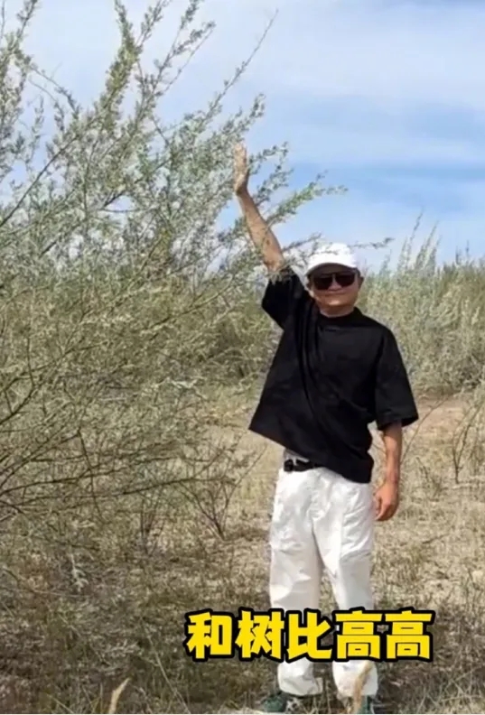 探訪期間,馬云還站在一棵樹旁與樹比高。