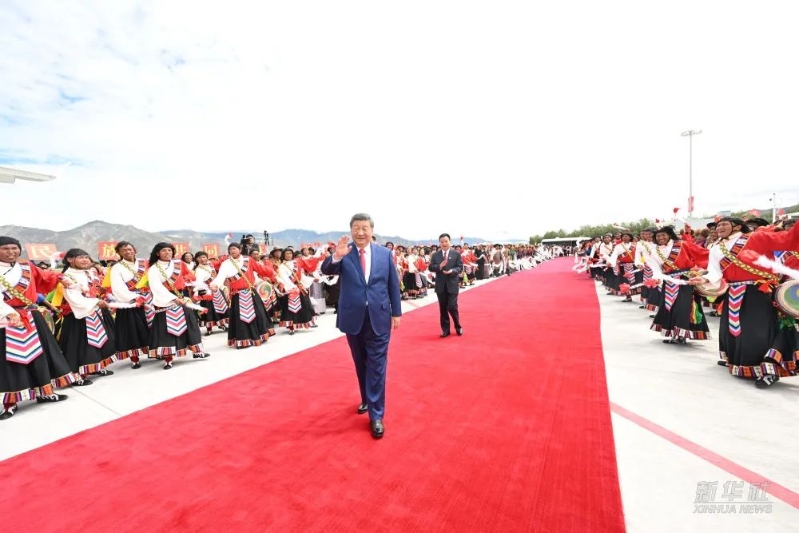 習近平離開西藏時,各族群眾紛紛來到拉薩市區(qū)的沿途道路兩旁,揮舞紅旗、手捧哈達,歡呼著向總書記問好,向總書記表達由衷的愛戴。拉薩貢嘎機場,身著節(jié)日盛裝的干部群眾揮舞著紅旗和花束,載歌載舞,高喊“扎西德勒”,表達高原兒女對以習近平同志為核心的黨中央的感激之情、對建設社會主義現(xiàn)代化新西藏的堅定信心。